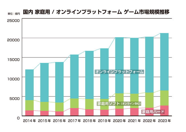 ※オンラインプラットフォーム……スマートフォン、タブレット、PCなど、ネットワーク接続を前提にゲームコンテンツが動作するプラットフォーム。ただし、家庭用ゲーム全体の市場規模を明確にするため、下記のグラフに限って家庭用ゲーム機向けのオンライン市場は「家庭用ソフト」に含めている。