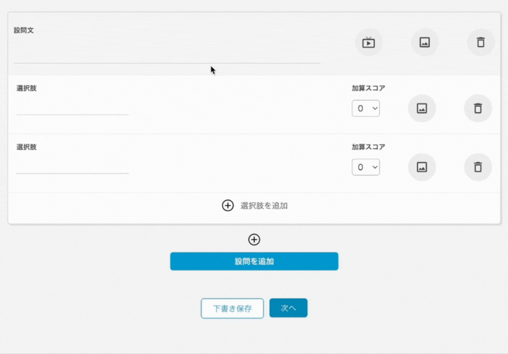 点数式選択肢にかかわらず、設問を固定する方式です。回答者の点数に応じて結果を出すことができるため、明確な基準がある場合などに有用な方式です。