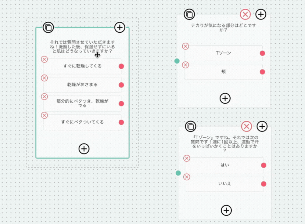 フローチャート選択肢によって設問を分岐することができる方式です。エンドユーザーの回答によって設問を分けたい場合などに有用な方式です。