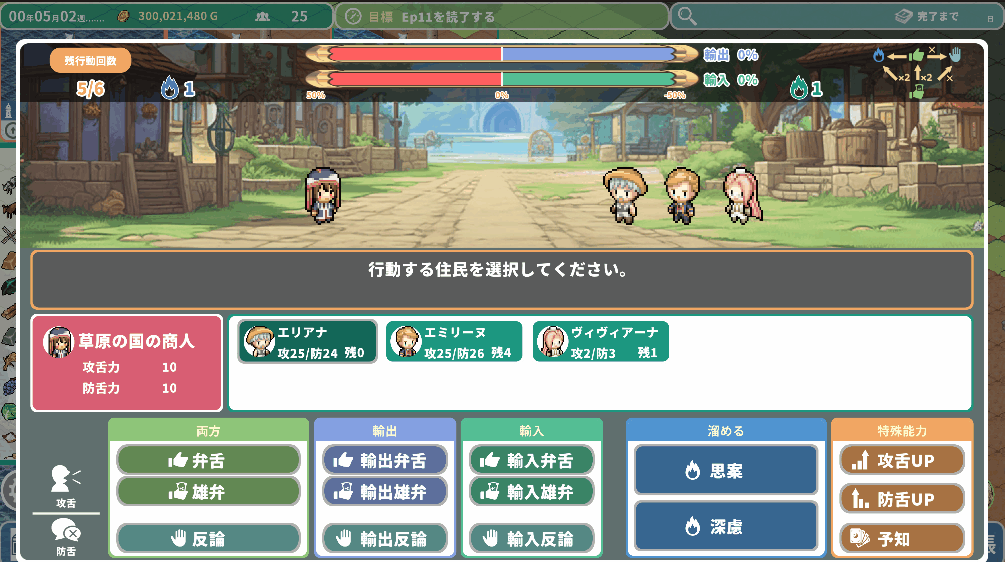 目的の国に到着したら、値段交渉のための「商談バトル」を実施しましょう!商談バトルはロタ自らが行うことも、雇用した商人が行うことも可能です。どれだけ輸入品を安く買い、同時に輸出品を高く売り付けられるか、という今作の最大の山場はストーリーにも大きく影響します。