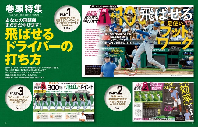 飛距離ダウンに悩むゴルファーのなんと多いことか。そんな悩みに応える大特集です。題して、あなたの飛距離はまだまだ伸びます!あと10ヤード飛ばせる足使い。飛距離アップのポイント中でもテーマをフットワークに絞っての内容です。パート1は大谷翔平がお手本!として、体を回し続けるためには左足を踏ん張るのではなく、カカトを中心にして回してしまおうというレッスン。パート2はプロコーチの奥嶋誠昭によるヘッドスピードのあげ方。パート3は男子ツアーの飛ばし屋たちのドライバーショットの連続写真を使っての飛ばしのポイントを解説。