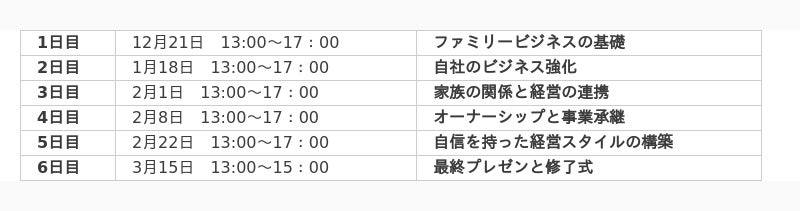 本プログラムは、ファミリービジネス、経営スキル、ファミリー間のコミュニケーション、オーナーシップ、自己ブランディングに関する6つのテーマを中心に構成されています。