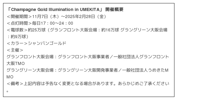 グランフロント大阪とグラングリーン大阪では、11月7日(木)~2025年2月28日(金)の期間中、うめきたエリア(大阪駅北地区)の冬の夜を彩るイベント「Champagne Gold Illumination in UMEKITA」を開催します。