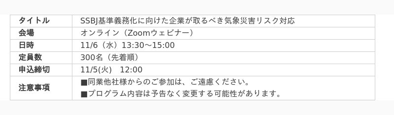 【11/6(水)開催 】オンラインセミナー「SSBJ基準義務化に向けた企業が取るべき気象災害リスク対応」