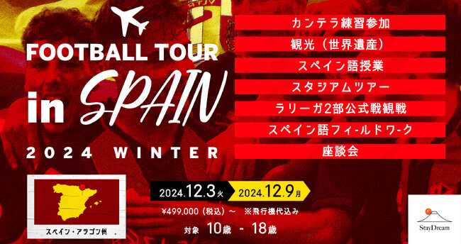 欧州・北米・東南アジアを中心に世界7カ国のサッカー留学支援事業を運営するステイドリームグループ株式会社(本部:東京都新宿区、代表取締役:宮川 類)は、スペイン2部カンテラで7日間体験する小中高校生向け短期留学プログラム「スペインサッカー短期留学2024冬」を2024年12月3日(火)~12月9日(火)で開催します。