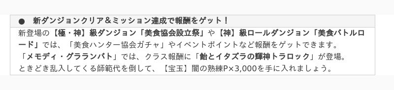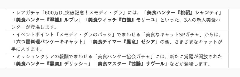 また、新ユニークソウル「美食ハンター会長の証」の登場や、交換所にて「【宝玉】チョウカクチョウ」が毎月1回交換可能になるなど新要素も盛りだくさんでお届けします。「600万DL突破記念!メモディ・グラ~6million memorial Summons Halloween~」をどうぞお楽しみください。