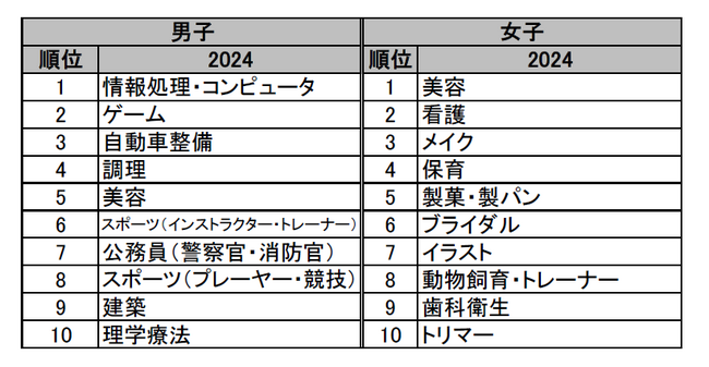 男子のトップ3は2019、2020年は1.ゲーム、2.自動車整備、3.情報処理・コンピュータの順であったが、2021年から「情報処理・コンピュータ」が1位に上がり、その後3年間その順位を維持している。コロナ禍の中でリモートワーク、オンラインミーティング等の業務形態の認知が一気に広がったこと、AIやデータサイエンス、DX、情報セキュリティ等の新分野の産業の興隆、専門人材の不足が叫ばれるようになったことなどを反映した動きと考えられる。