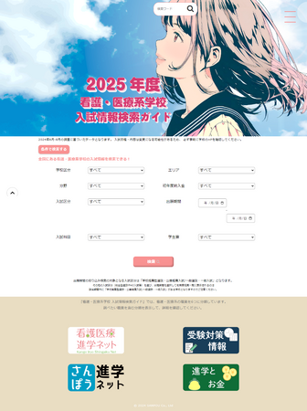 高校生向け進路情報と進路イベントを手掛ける株式会社さんぽう(本社:東京都渋谷区、代表取締役社長:渡邉王雄)は2024年9月、公開中のWebサイト「看護医療進学ネット」に「看護・医療系学校入試情報検索ガイド」の機能を追加した。発行終了の情報誌「看護・医療系 入学全ガイド」掲載の入試情報が、Web上で検索できるようになった。看護・医療系学校に特化した検索サイトとして、さらに利用者のニーズに応えていく。