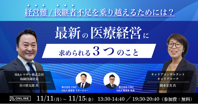 【11/11(月)~11/15(金)開催】港区立産業振興センター後援|【クリニック・病院オーナー様必見】経営難/後継者不足を乗り越えるためには?最新の医療経営に求められる3つのこと