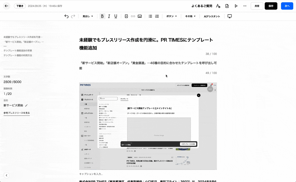 今年8月には、プレスリリース入稿(作成)画面上で、46種の発表目的に合わせたテンプレートを選択できるテンプレート機能を追加、9月には、これまで搭載していた校正機能をアップデートし、曜日の間違いや語尾の統一などのプレスリリースの文章を整えることに特化した機能追加をおこなっています。