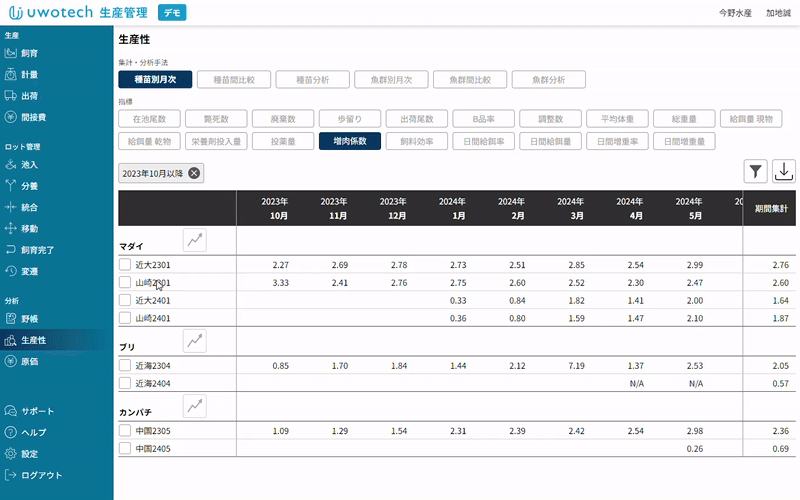 種苗や魚群ごとに増肉係数や歩留り等を自動で集計。手軽にデータを分析できる