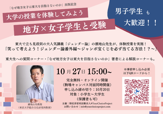 本講演会は、#YourChoiceProjectが光文社新書「なぜ地方女子は東大を目指さないのか」出版を記念して、全国の高校生・大学生を対象に特別講義として行うものです。