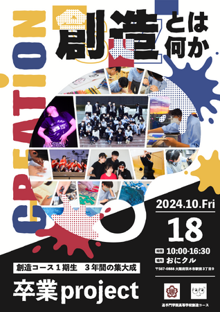 探究・プロジェクト型の学びを中心にしたカリキュラムを展開する追手門学院高等学校(大阪府茨木市、校長:木内 淳詞)の創造コース1期生が10月18日(金)、3年間の学びの集大成となる「卒業プロジェクト」を、茨木市にある文化・子育て複合施設「おにクル」で開催します。