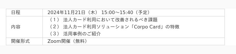 法人カード利用ソリューション「Corpo Card」無料セミナー開催のお知らせ