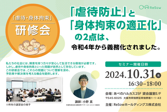 ReSowホールディングス株式会社(本社:大阪市)は、10月31日(木)大阪・あべのハルカスで「虐待防止・身体拘束適正化研修」を開催し、一般参加者を募集します。