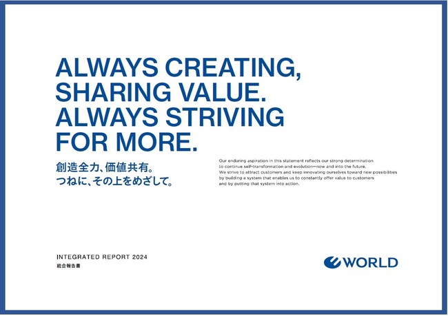 統合報告書は、ワールド コーポレートサイト(https://corp.world.co.jp/ )にてダウンロード可能です。ワールドは今後も定期的に統合報告書を発行し、透明性のある情報提供を継続していく所存です。持続可能な社会の実現に向けて一層努力し、全てのステークホルダーの皆様にとって価値ある企業であり続けることを目指してまいります。※英語版は追って年内公開予定です。