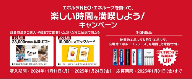 パナソニック エナジー株式会社は、2024年11月11日から2025年1月24日までの間、「エボルタNEO・エネループを買って、楽しい時間を満喫しよう!」キャンペーンを実施します。