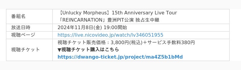 [Unlucky Morpheus]11/8(金)15周年ツアー豊洲PIT公演のニコニコ生放送独占生中継が決定&過去ライブ映像を配信する「3夜連続ライブ映像NIGHT」も開催決定