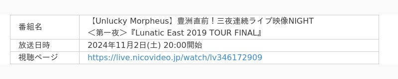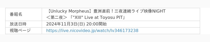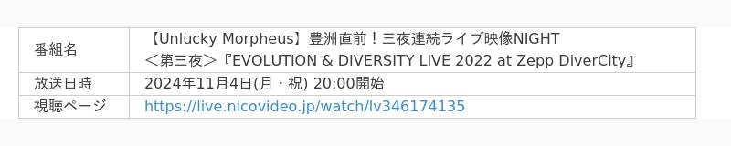 11月8日の豊洲PIT公演直前に、Unlucky Morpheusの過去ライブ映像を2024年11月2日(土)、3日(日)、4日(月・祝)の20時から3夜連続で放送いたします。