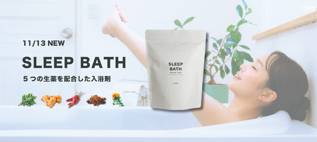 SLEEP BATHは、5種の生薬と2種の温泉成分を配合した医薬部外品で、独自処方による有効成分が温浴効果を高めて疲労を軽減します。