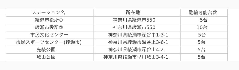 神奈川県綾瀬市は、神奈川県のほぼ中央に位置する都心から約40kmにある自治体です。同市には鉄道駅がなく、複合的な交通手段の展開による移動手段の確保や利便性向上が求められていました。また、隣接する複数の自治体がシェアサイクルの導入を拡大している状況があり、一体的にシェサイクルを展開していくことによって、市内外の交通ネットワークがさらに充実していくことが期待できることから、シェアサイクルの可能性を検討していました。