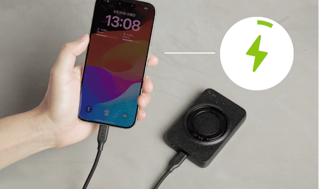 ケーブルでスマホとつなぐと、最大20Wの急速充電にも対応! iPhone15シリーズであれば、30分で約50%の充電が可能です。