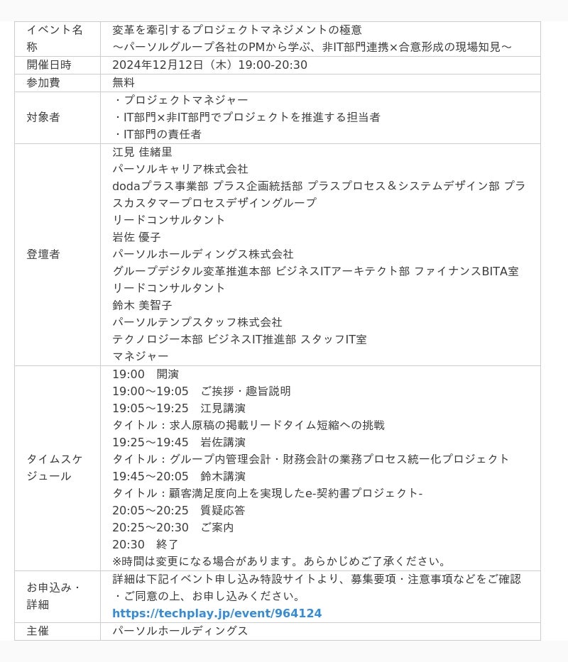 本イベントでお伝えする手法や知見は、プロジェクト推進の課題解決や、非IT部門との円滑な連携に悩むプロジェクトマネジャーの方にとって、すぐに活かせる実践法が詰まった内容となります。
