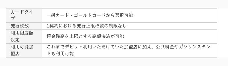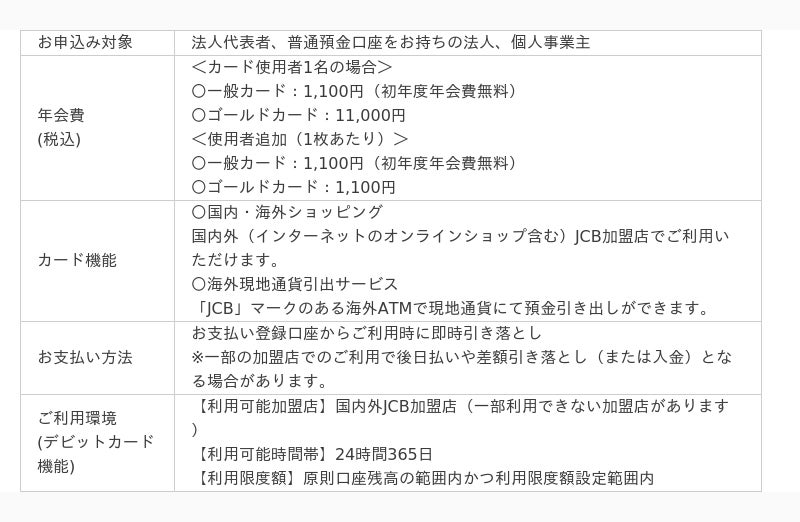 本カードは、JCBグループとして新しい機能を搭載した法人向けデビットカードで、普通預金口座をお持ちの法人・個人事業主であれば設立年数や決算内容に関わらずお申込みいただけます。国内外のJCB加盟店約4,900万店でご利用可能で、ご利用代金が直接ご指定口座から引き落とされ、ご指定口座の預金残高内でご利用いただけるため、高額決済にもご利用いただけます。法人様ご自身でご利用カードごとに利用限度額を設定いただけるため、使い過ぎの心配がなく安心してご利用いただけます。また、ご利用金額に応じてポイントもたまる便利でお得なカードです。