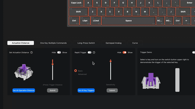 Keychron Launcher Webアプリに対応し、簡単に全てのキーを自在にリマップでき、アクチュエーションポイントの調整や、キーを押す深さに応じての複数のアクション設定などが可能です。