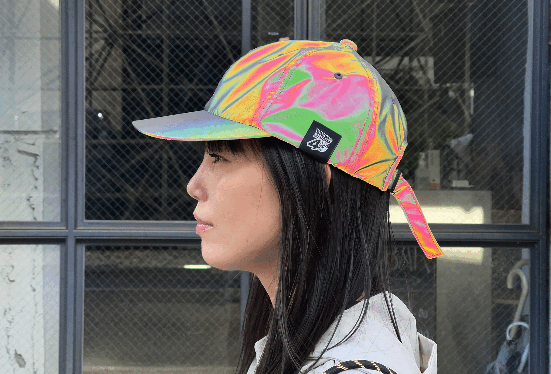 5年前にオーロラリフレクター生地で作ったキャップの試作をSNSにアップしたところ、「バック・トゥ・ザ・フューチャーのキャップに似ているんじゃないか!?」と、多くの反響をいただきました。