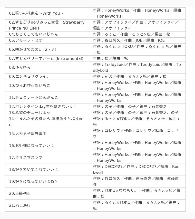 ベストアルバム『Strawberry Prince Forever』は、すとぷり初のベストアルバムで、デビュー曲“Strawberry Prince Forever”から最新曲までの人気楽曲を80曲以上収録した豪華4枚組アルバムです。その2枚目のディスクとなる「DISC2すとろべりーすいーと」の収録曲が2024年12月1日(日)のすとぷり公式生放送において発表されました。収録曲は以下の通りです。