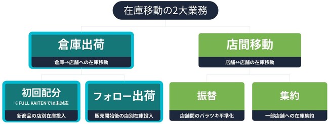 図の左側は倉庫から店舗に出荷し、図の右側は店舗から店舗へ商品を移動させる業務を指します。今回提供を開始するのは、倉庫出荷の「フォロー出荷」です。