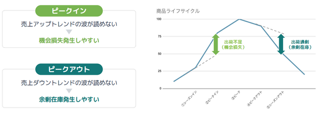 ・売上が大きく下降し、売場の縮小期間であるピークアウトでは出荷が過剰になり余剰在庫が発生しやすい