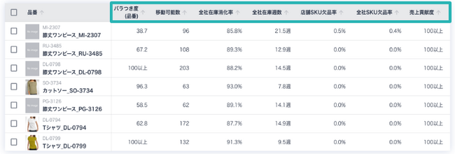店舗×SKU毎の在庫週数の移動可能数、移動可能金額、売上貢献度などを参考に、在庫移動リストを作成することもできます。