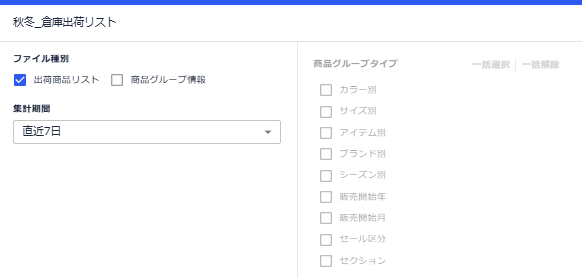 出荷の目的に応じて「出荷元」「出荷先」「商品グループ情報」の3ファイルを選択できます。