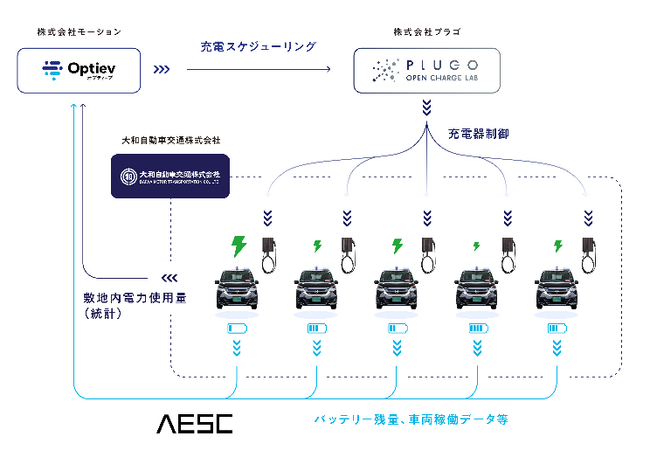 大和自動車交通株式会社(本社:東京都江東区、代表取締役社長:大塚 一基、以下「大和自動車交通」)、株式会社モーション(本社:東京都文京区、代表取締役:上杉 顕一郎、以下「モーション」)、株式会社プラゴ(本社:東京都品川区、代表取締役:大川 直樹、以下「プラゴ」)、株式会社AESCジャパン(本社:神奈川県横浜市、CEO:松本 昌一、以下「AESC」)は、事業用に複数台の電気自動車(EV)を用いる企業において、より高度かつ効率的な充電の運用を実現するための実証実験を12月2日(月)に開始しました。
