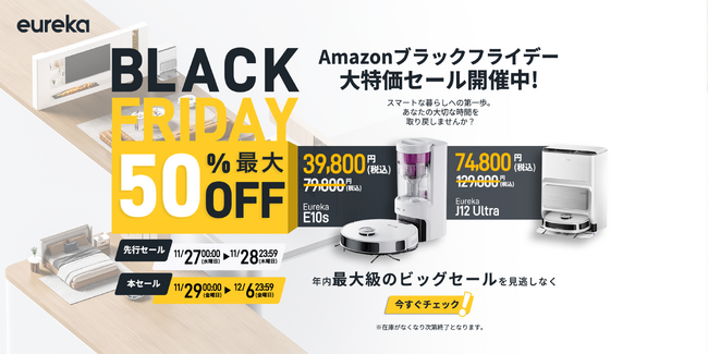 Eureka(ユーレカ、本社:アメリカ ニュー・ジャージー州)は、2024年11月27日(水)から12月6日(金)までの10日間、Amazonおよび楽天市場公式販売元にてブラックフライデーセールを実施いたします。人気のロボット掃除機及びカーペットクリーナーを最大50%OFFという特別価格でお求めいただけます。