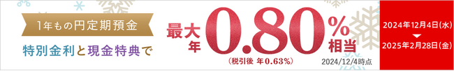 キャンペーン期間中の2024年12月4日(水)から2025年2月28日(金)まで、1年もの円定期預金の新規お預入れに対して、通常金利年0.20%(税引後 年0.15%)(注1)に年0.45%(税引後 年0.35%)を上乗せした特別金利年0.65%(税引後 年0.51%)を提供します。
