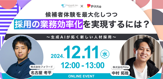 生成AIを活用した採用支援SaaSプロダクト「エースジョブ」を開発・提供する株式会社フォワード(本社:東京都渋谷区、代表:名古屋 考平、以下「フォワード」)は、株式会社Pittaと共催で「候補者体験を最大化しつつ、採用の業務効率化を実現するには?」を12/11(水)に開催いたします。