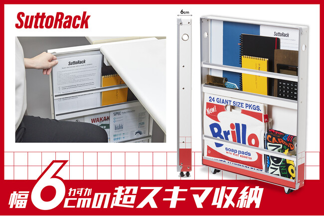 幅わずか6cmの超薄型ラックです。デスク周りや壁際などのちょっとしたデットスペースにスッと収納し、サッと引き出すことができます。