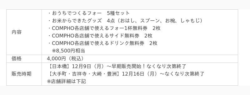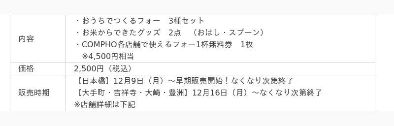 「華」と「雅」の2種類から選べる!おうちでつくるフォー、お米からできたグッズ、店舗で使える無料券がつまったお得なセット。COMPHO日本橋高島屋S.C.店では12月9日(月)より先行販売