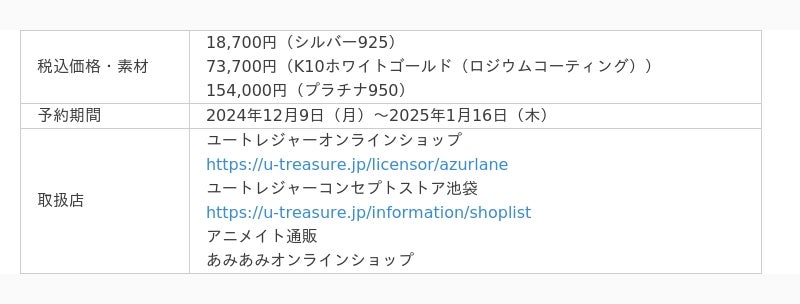 株式会社ユートレジャー(本社:東京都新宿区、代表取締役:伊藤 崇史)は、スマートフォン向けゲームアプリ「アズールレーン」とのコラボレーションアイテム「モチーフリング(指輪)」全3種類(フッド、島風、ウルリッヒ・フォン・フッテン)の予約受け付けを、2024年12月9日(月)~2025年1月16日(木)の期間、ユートレジャーオンラインショップ、ユートレジャーコンセプトストア池袋にて行います。