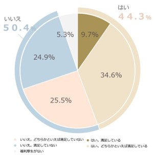 いいえ 50.4% 内訳「いいえ、どちらかといえば満足していない25.5%」「いいえ、満足していない24.9%」「福利厚生がない5.3%」