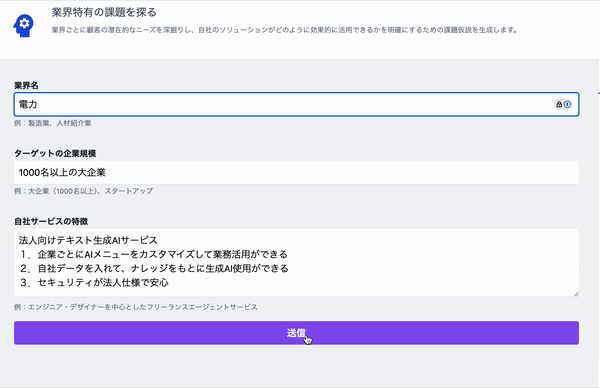 目的別のAIメニューを選択し、画面に表示される2~3つの項目に回答するだけで理想的なアウトプットが可能。「ChatGPTなどを使っても思ったような結果が返ってこない」というお悩みを抱える方にも使いやすいプロダクトです。