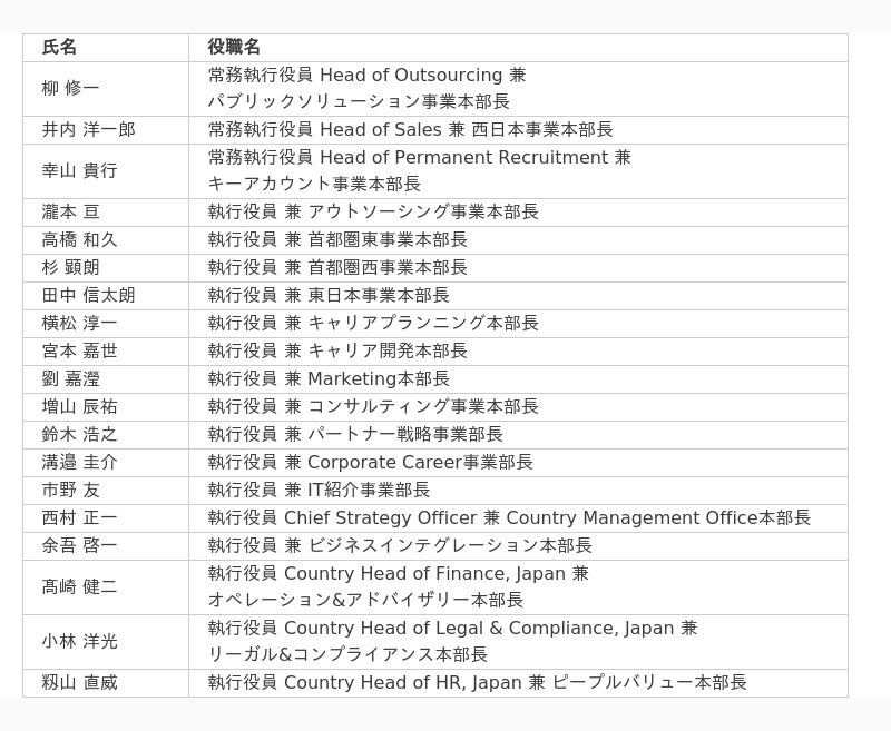 当社は、「『人財躍動化』を通じて、社会を変える。」をビジョンとして掲げ、仕事を通じて躍動する人財の輩出と、人財が躍動できる環境の創出により、社会へ変革をもたらすことを目指しています。本経営体制のもと、中核事業である人財派遣、人財紹介・転職支援、アウトソーシング、HRコンサルティングの強化をはじめ、様々な取り組みを通じて、働く人々と組織の躍動の実現に貢献してまいります。