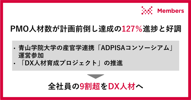 - - メンバーズが培ってきた年間投資約6億円のデジタル人材育成ノウハウの活用や、新しい知識やスキルへの社員の学習する意欲、企業からのPMO人材に対するニーズの高さなどが要因となり、スピーディな目標達成につながった。