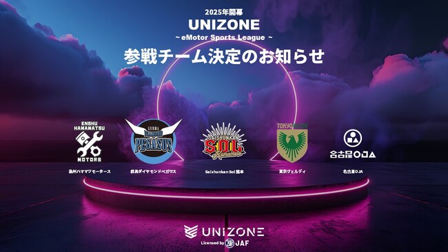 国内で唯一JAF(日本自動車連盟)の公認を受けたeモータースポーツ大会(レーシングゲームを使用したeスポーツ大会)「UNIZONE(ユニゾーン)」を運営する一般社団法人日本eモータースポーツ機構(東京都千代田区、代表理事:出井宏明、以下「JeMO」)は、2025年2月に開幕する「UNIZONE」へ参戦する5チームが決定しましたのでお知らせします。