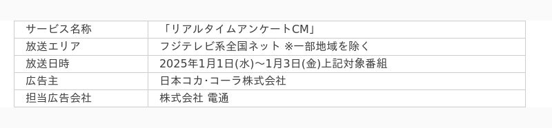 株式会社フジテレビジョン(本社:東京都港区台場2-4-8、代表:港浩一)は、2025年1月1(水)~1月3日(金)の3日間、フジテレビのお正月特別番組において、視聴者の選択をリアルタイムでCMに反映する新しいテレビ広告サービス「リアルタイムアンケートCM」を実施します。