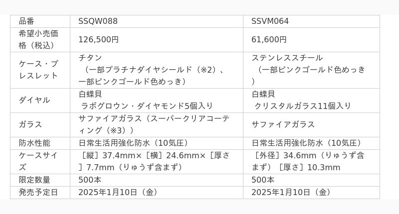 セイコーウオッチ株式会社(代表取締役社長:内藤 昭男、本社:東京都中央区)は、<セイコー ルキア>と<セイコーセレクション>から、2025 SAKURA Blooming 限定モデル4種を2025年1月10日(金)より発売いたします。希望小売価格は、38,500 円~126,500円(税込)です。