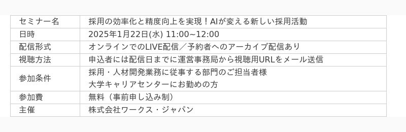 株式会社ワークス・ジャパン(本社:東京都千代田区、代表取締役:清水信一郎)は、パナソニックグループに提供している採用管理ツール「e2R」にAI機能を実装したことを機に、2025年1月22日(水)に企業の人事担当者及び人材開発担当者を対象にしたオンラインフォーラム、WORKS REVIEW『採用の効率化と精度向上を実現!AIが変える新しい採用活動』を開催します。